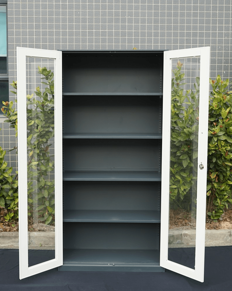 Featuring two large front glass doors, the cabinet offers easy access to stored items. Adjustable shelves inside provide flexibility to accommodate books, decorative items, electronics, or office essentials. This organization-friendly design keeps your belongings tidy and visible, combining elegance with functionality.